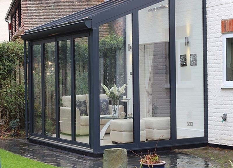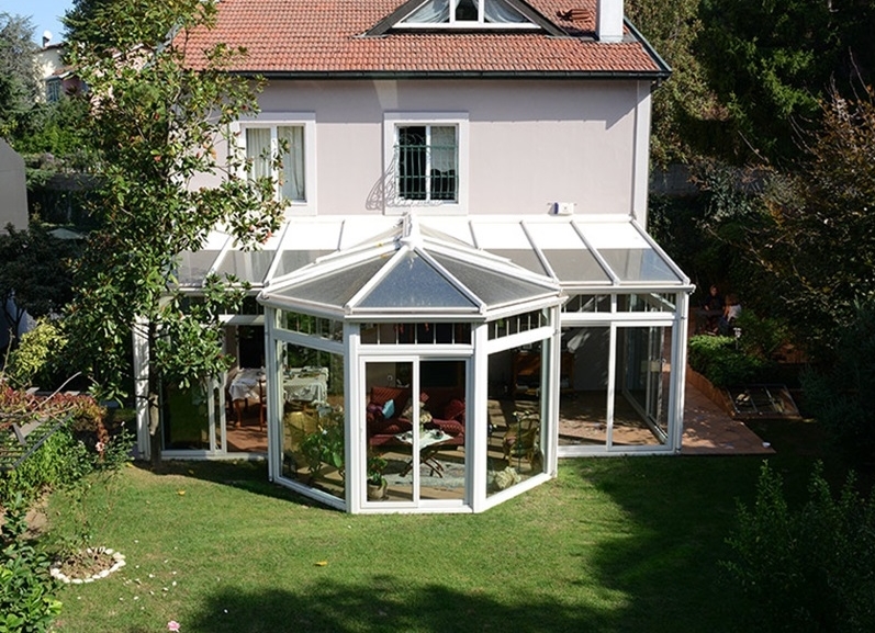 Cam çatılı kış bahçelerinin etrafı pvc, alüminyum veya katlanır cam olarak dizayn edilebilir.